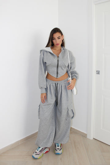 Tuta composta da pantalone con elastico in vita con lacci e felpa con zip sul davanti e con cappuccio sul retro