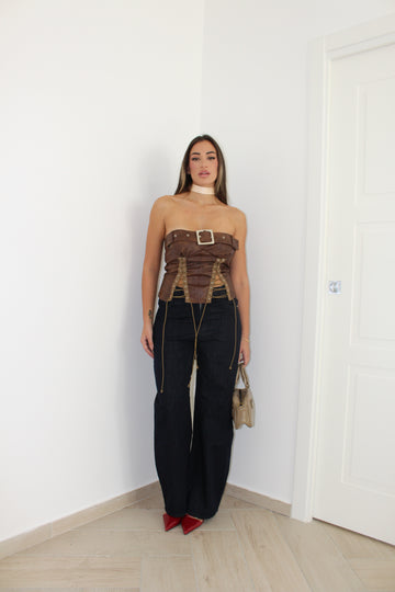 Jeans in denim scuro con particolarità sul retro con stringhe in tessuto