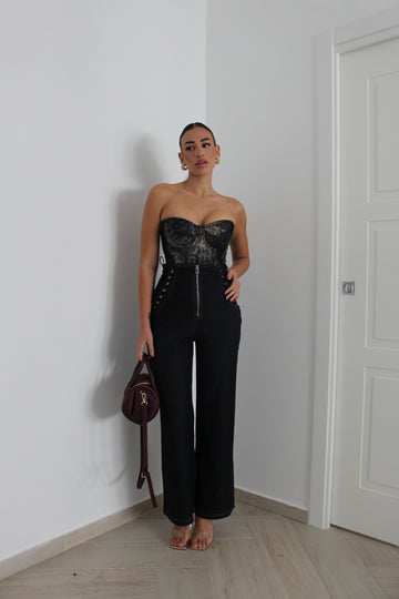 Pantalone a vita alta con stringhe laterali e zip sul davanti