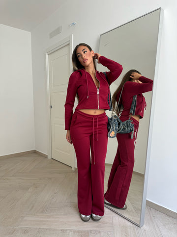 Tuta composta da pantalone con elastico in vita con lacci e felpa con zip sul davanti e con cappuccio sul retro